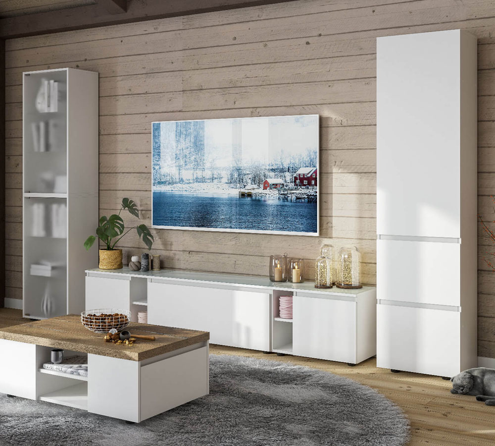 Модульная гостиная Одри это: Универсальная «Тумба», которая выступает как тумба TV, либо подвесная тумба. В базовой комплектации тумбы идут регулируемые опоры. При этом ее можно подвесить как с условием открытия створки сверху вниз, так и в перевернутом виде с открытием створки снизу вверх. Тумба покрыта матовым стеклом «сатинат» с фацетными гранями. Из нескольких тумб, прикроватных тумб, можно собрать композиции комодов различных габаритов.