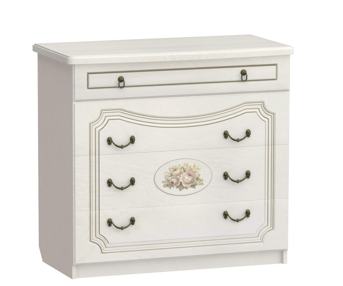 Светлый комод имеет четыре выдвижных ящика с использованием механизма полного выдвижения и плавного закрывания, дно ящика выполнено из ЛДВП в цвет корпуса