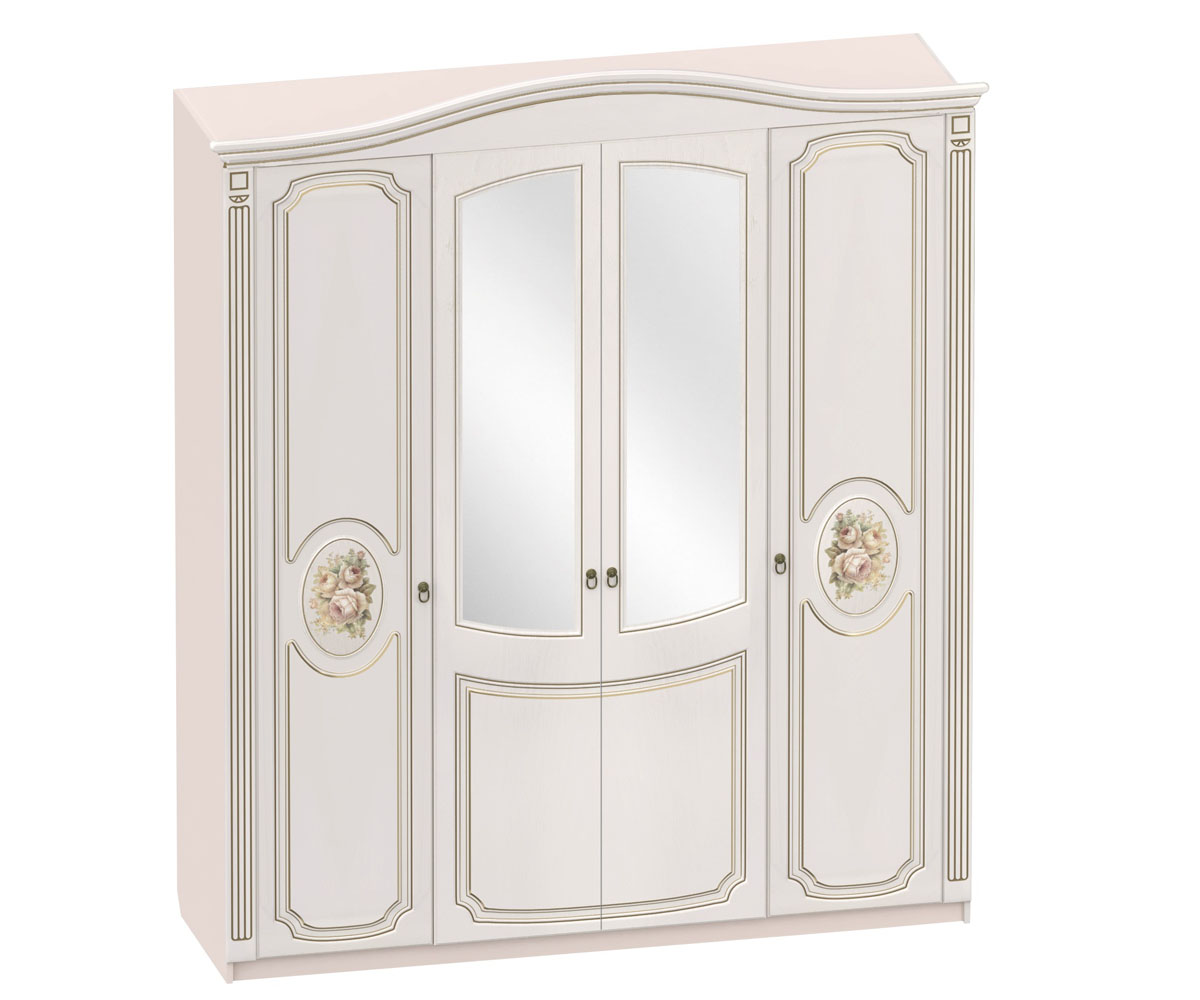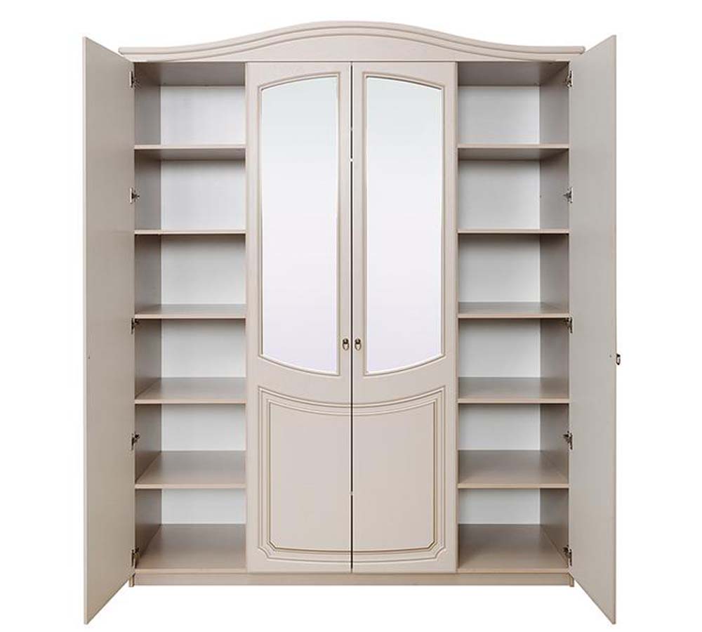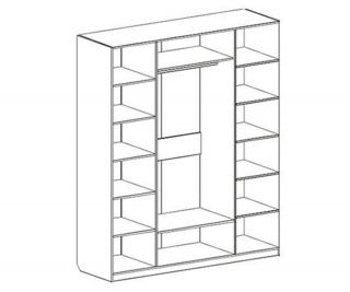 Четырёхдверный шкаф с зеркалами Верона шириной 190 см состоит из 3-х секций: справа и слева узкие секции с пятью полками, за двумя центральными дверями – широкая, внутри сверху и снизу полка, под верхней полкой – штанга, на которой вы можете разместить одежду на плечиках.