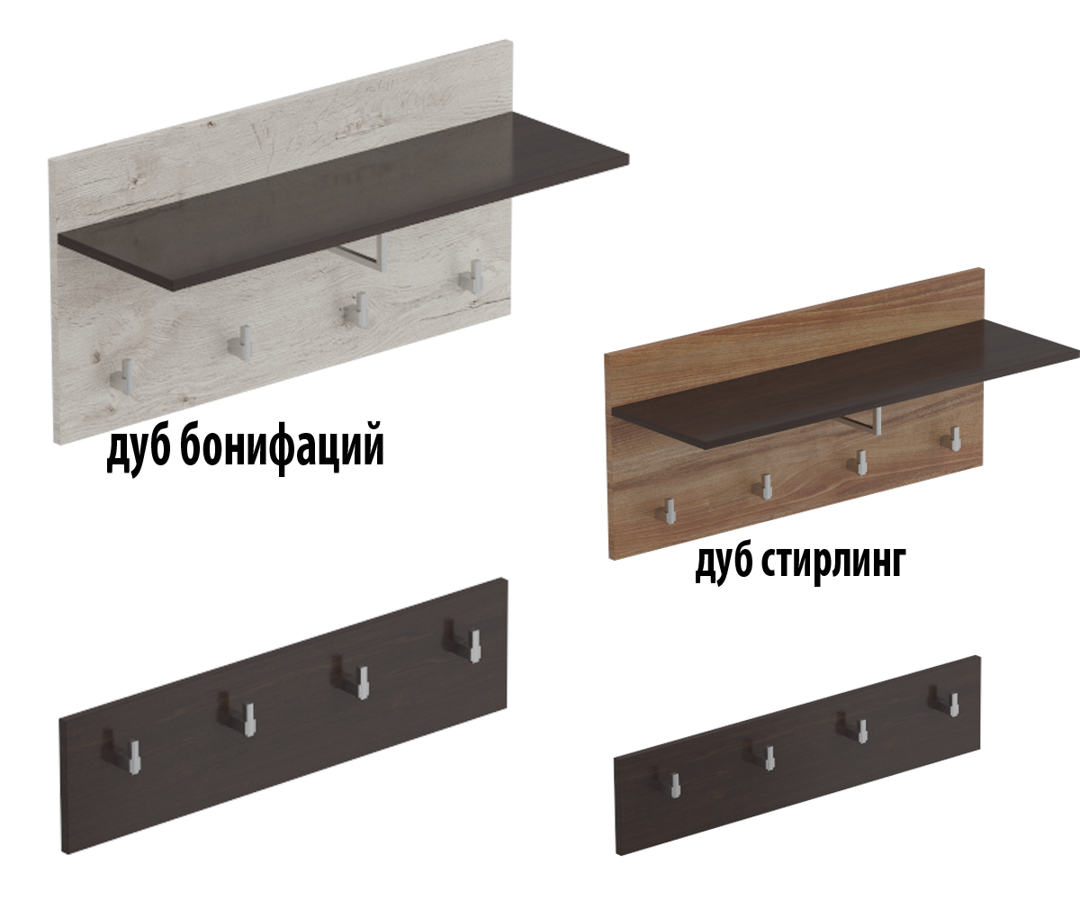Удобная двухкомпонентная настенная полка. Верхняя часть представляет собой панель в базовой тонировке с полкой в цвете венге. Под полкой закреплен угловой полкодержатель, выполняющий функцию держателя для вешалок, и четыре крючка для одежды. Нижняя при стенная панель в цвете венге оснащена четырьмя крючками.