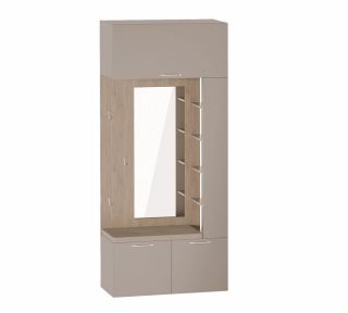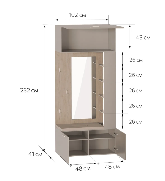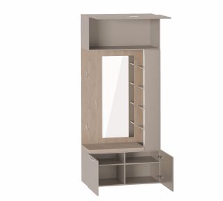 Верхняя полка модуля имеет встроенный газлифт и позволит разместить объемный чемодан. Вертикальный ряд полок выполнен на правую сторону, при желании можно распахнуть створку, прикрывающую ряд. Прочные крючки и ручки в форме скобы выполнены из белого матового металла. Все петли - плавного закрывания.