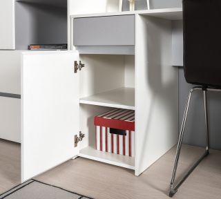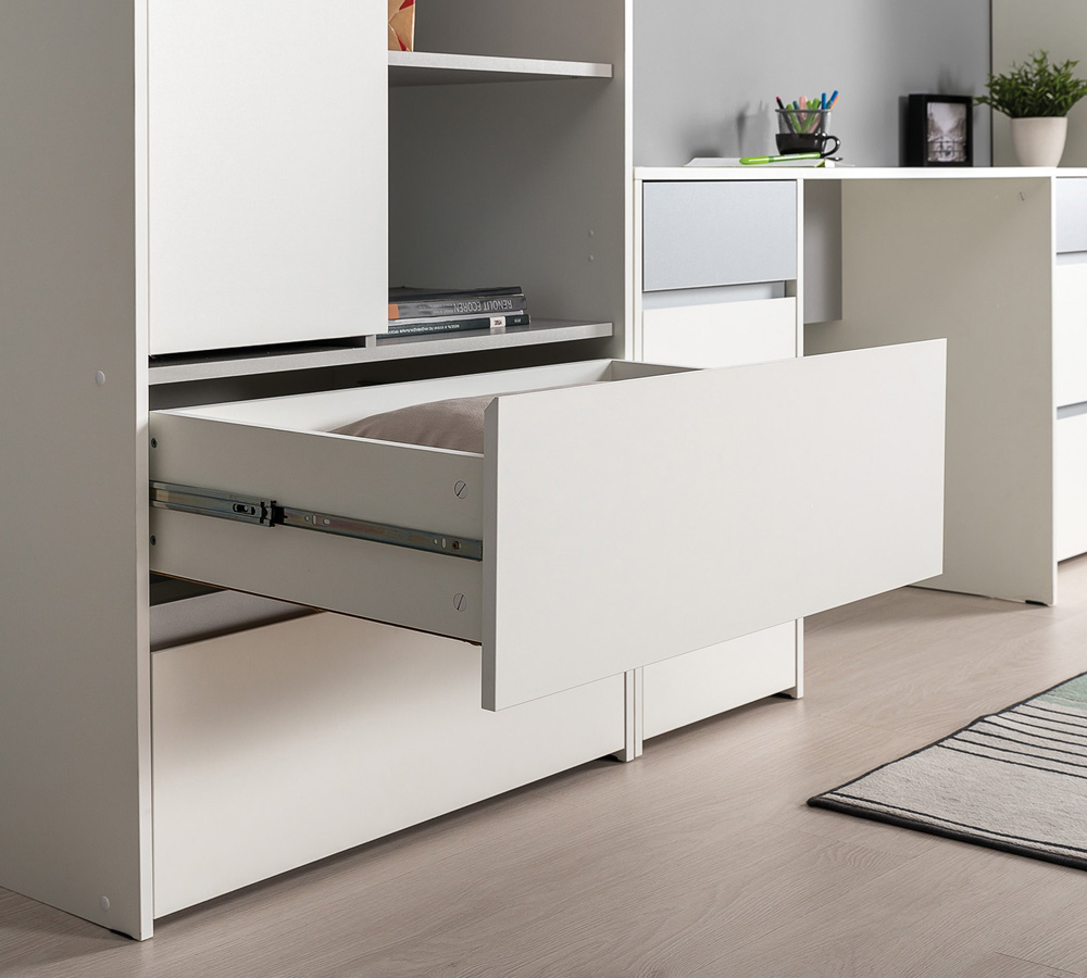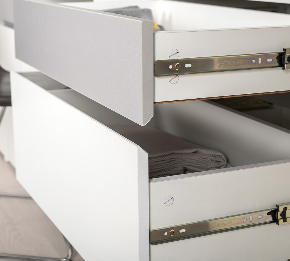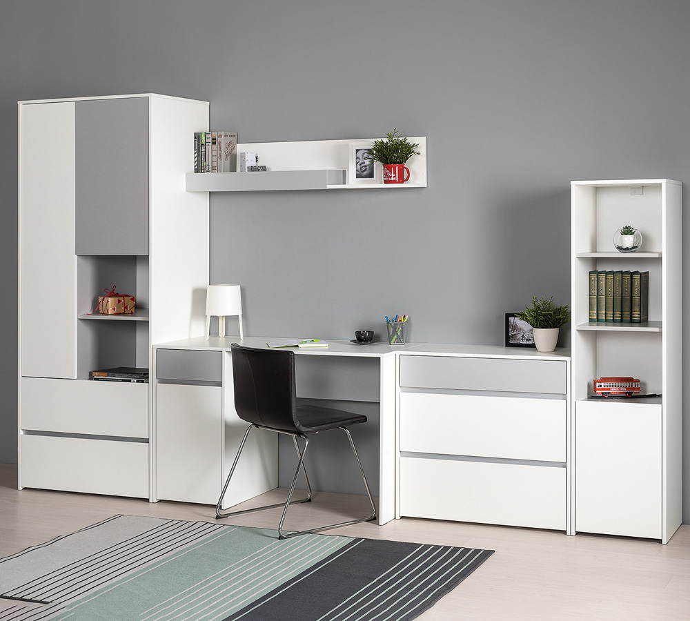 Стильная и актуальная мебель для молодёжной комнаты. Базовый белый цвет, сочетаясь с акцентным серым, создаёт нейтральную основу интерьера, чтобы подчеркнуть личные вещи и аксессуары. Отсутствие лицевой фурнитуры и открывание фасадов за край - не только стилевое, но функциональное решение. Так мебель занимает меньше места и дает возможность проходить вплотную с фасадом без риска зацепиться за ручку или травмироваться.