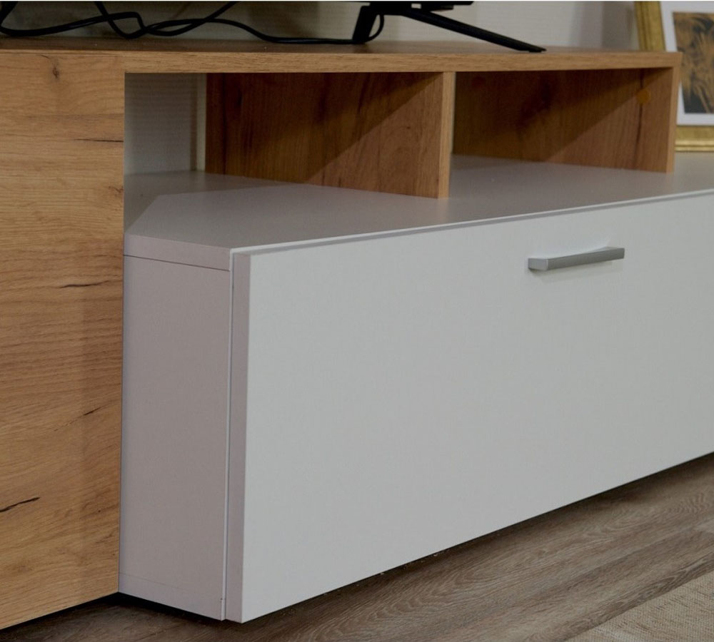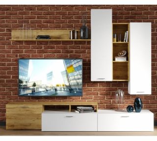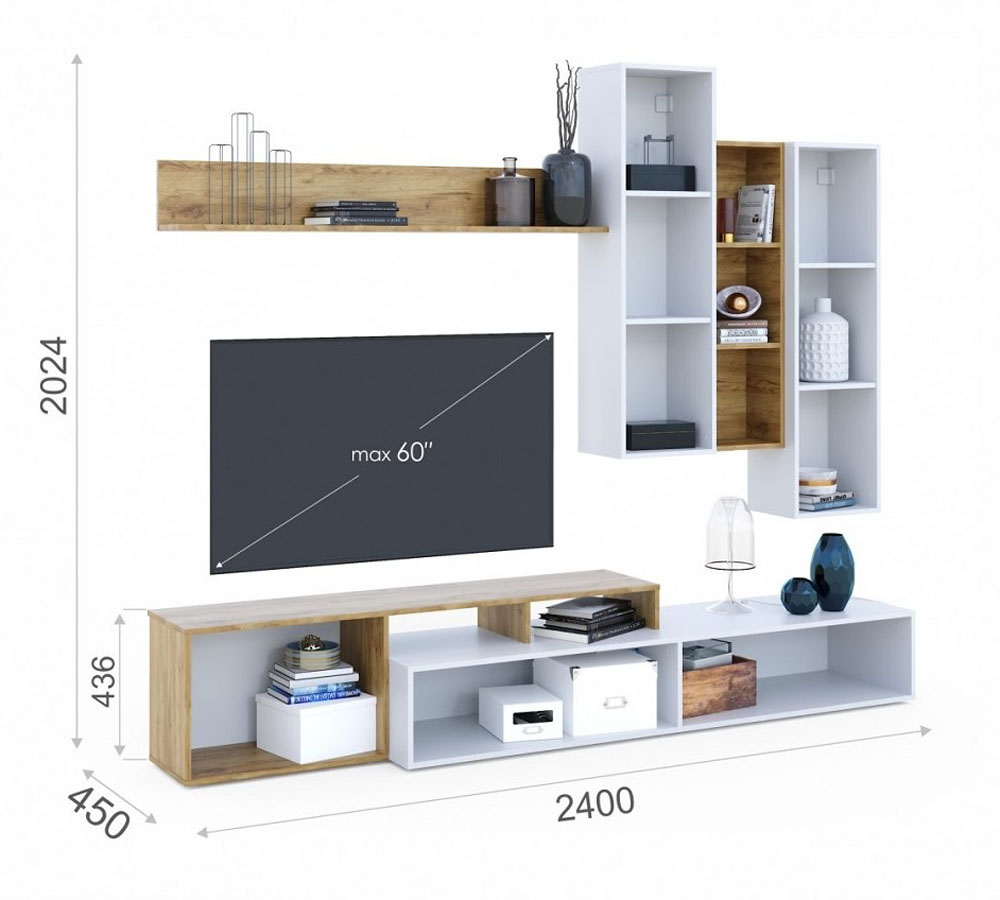 тенка выполнена с учетом новейших дизайнерских решений - сочетание теплого оттенка дерева с четкой древесной текстурой и белого цвета, разноуровневые модули, углубленный цоколь, скрытая крепежная фурнитура. Все эти элементы создают визуальную легкость и компактность стенки. Мебель легко устанавливается и регулируется по высоте. Широкая тумба для ТВ позволит разместить телевизор любой диагонали, полки послужат для размещения других медиа устройств.